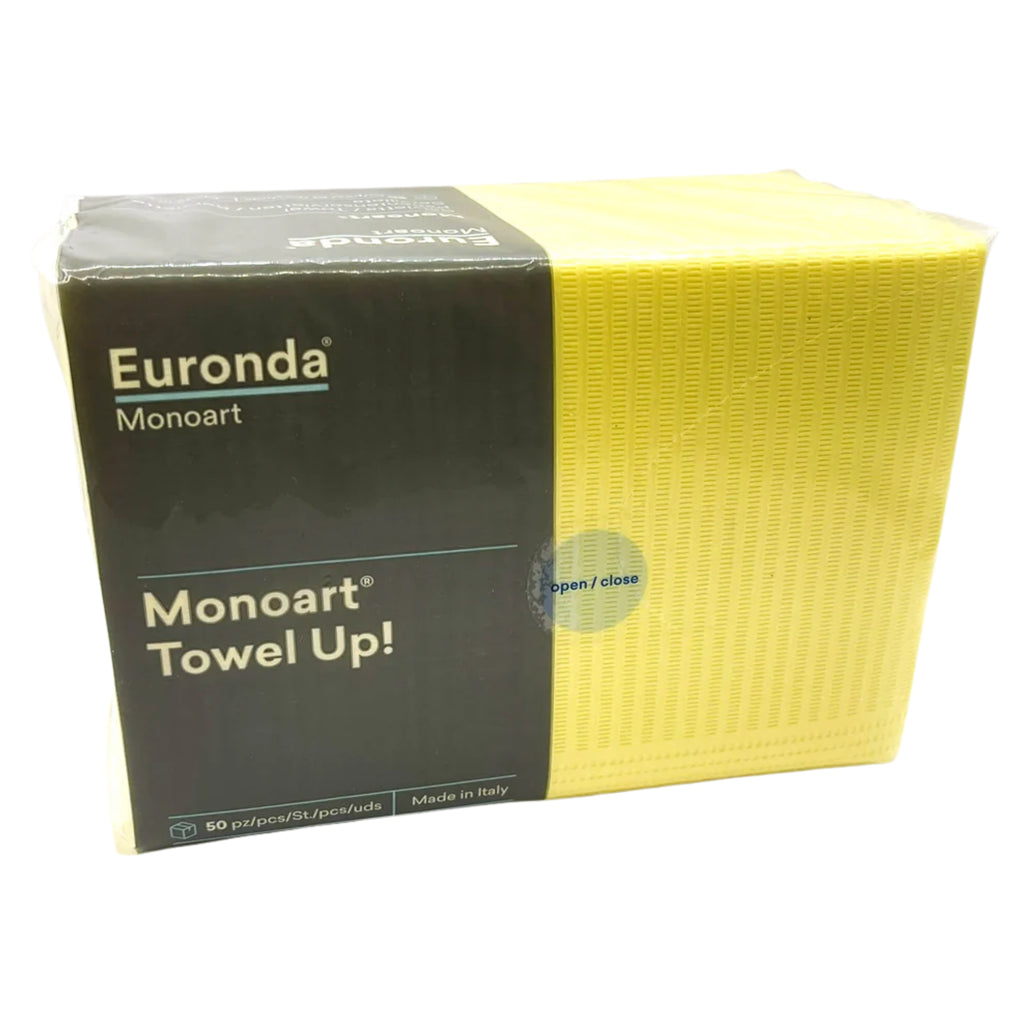 Las servilletas desechables Monoart® Towel Up! En color se fabrican en pura guata de celulosa altamente absorbente acoplada y gofrada con una capa de polietileno impermeable. Gracias al innovador envase con sistema abre/cierra, las servilletas se manipulan de forma individual y están protegidas del polvo y la contaminación para una higiene máxima y una gran comodidad de uso.