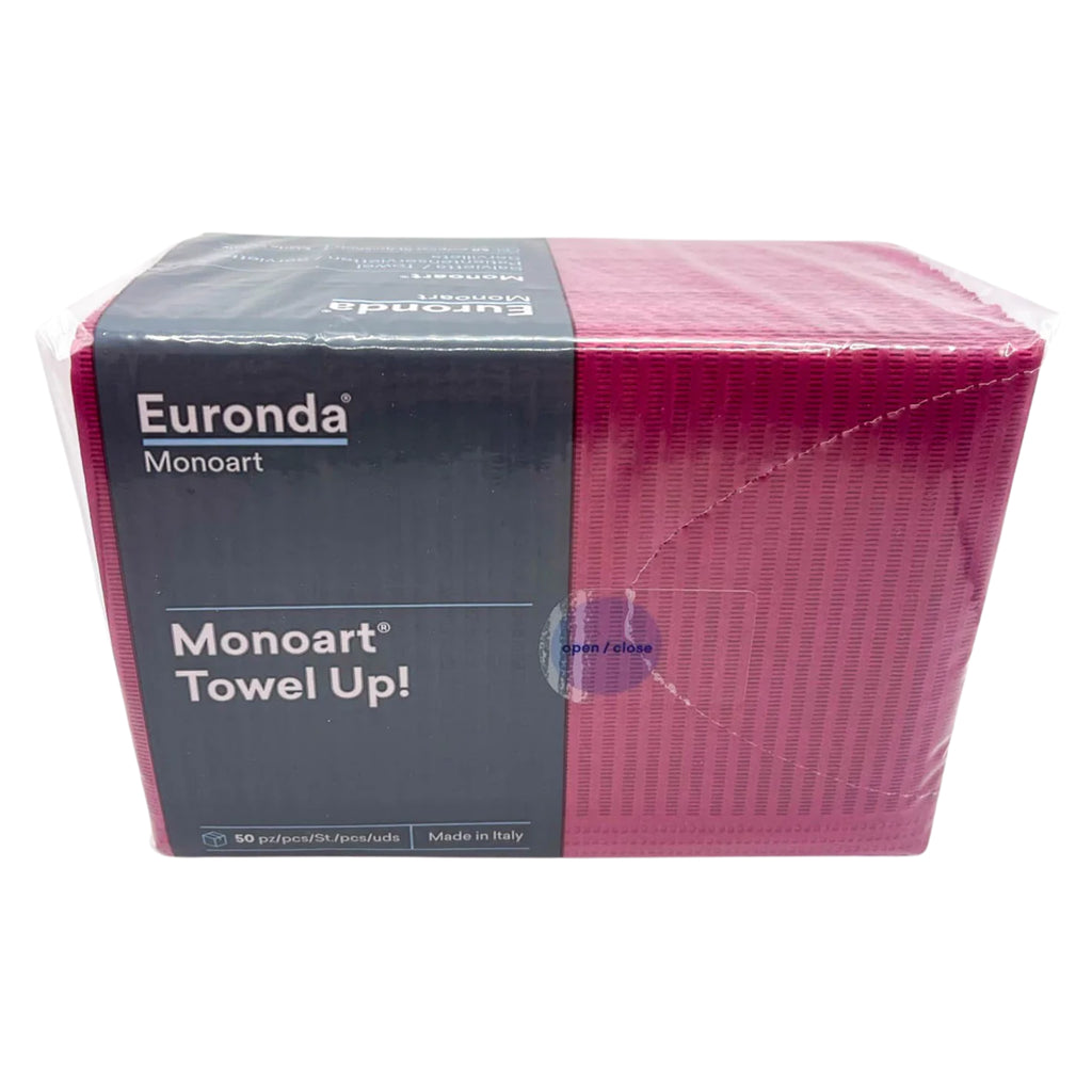 Las servilletas desechables Monoart® Towel Up! En color se fabrican en pura guata de celulosa altamente absorbente acoplada y gofrada con una capa de polietileno impermeable. Gracias al innovador envase con sistema abre/cierra, las servilletas se manipulan de forma individual y están protegidas del polvo y la contaminación para una higiene máxima y una gran comodidad de uso.