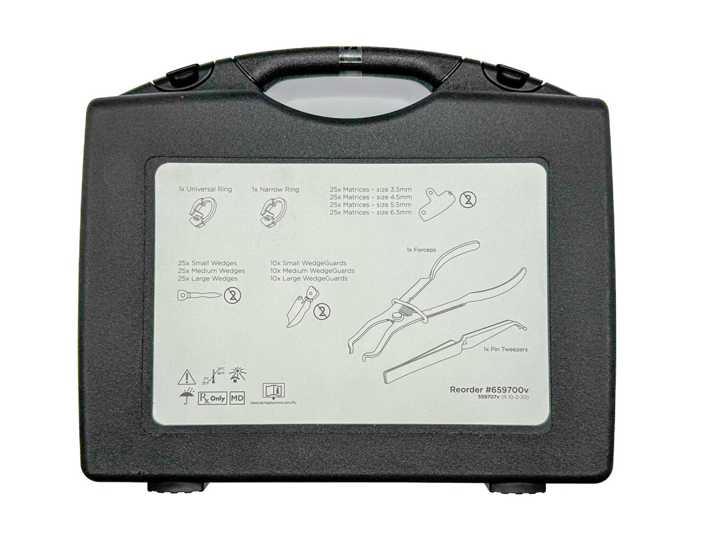 Sistema de matrices interproximales metálicas y precontorneadas para la creación de puntos de contacto precisos y rápidos, bandas disponibles en diferente tamaños, cuñas y anillos de Titanio.CONTENIDO100 Matrices (25 c/ numero, 3.5, 4.5 5.5 y 6.5 mm) 75 Cuñas 25 c/u (ch, m y g) 30 Cuñas de protecciónmetalica (ch, m y g) 2 Anillos (1 universal - 1 pequeño) 1 Pinza porta anillos 1 Pinza de colocaciónhttps://www.youtube.com/watch?v=e_muUTVNGic
