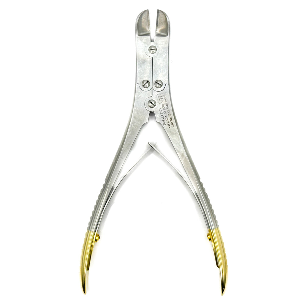 Pinza diseñada específicamente para el corte de alambres duros, utilizada en ortodoncia y procedimientos dentales que requieren una herramienta robusta y de alto desempeño.