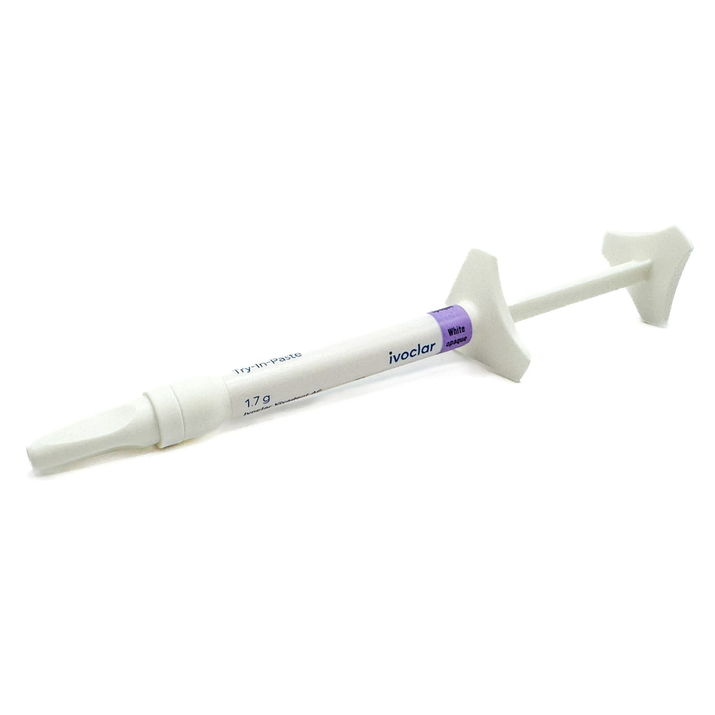 Variolink Esthetic Try-In Paste es una pasta de glicerina soluble en agua desarrollada por Ivoclar Vivadent, diseñada para simular el efecto cromático de las restauraciones cerámicas que se cementarán con el composite de cementación Variolink Esthetic.Características principales:Simulación precisa del color: Permite evaluar el tono final de la restauración antes de la cementación definitiva, facilitando la selección del color más adecuado y asegurando resultados estéticos óptimos.Fácil eliminación: Al ser una pasta hidrosoluble, se retira fácilmente con agua sin dejar residuos, simplificando el proceso clínico.Indicaciones:Prueba de restauraciones cerámicas como carillas, inlays, onlays, coronas y puentes, permitiendo visualizar el resultado estético antes de la cementación final.Tonos disponibles:Light+LightNeutralWarmWarm+Estos tonos están diseñados para coincidir con los colores del composite de cementación Variolink Esthetic, asegurando una correspondencia precisa entre la pasta de prueba y el material de cementación definitivo.Presentación:Jeringa de 1.7 gramos.El uso de Variolink Esthetic Try-In Paste facilita la comunicación entre el profesional dental y el paciente, permitiendo ajustes en el tono de la restauración antes de la cementación final y garantizando una satisfacción óptima con el resultado estético.